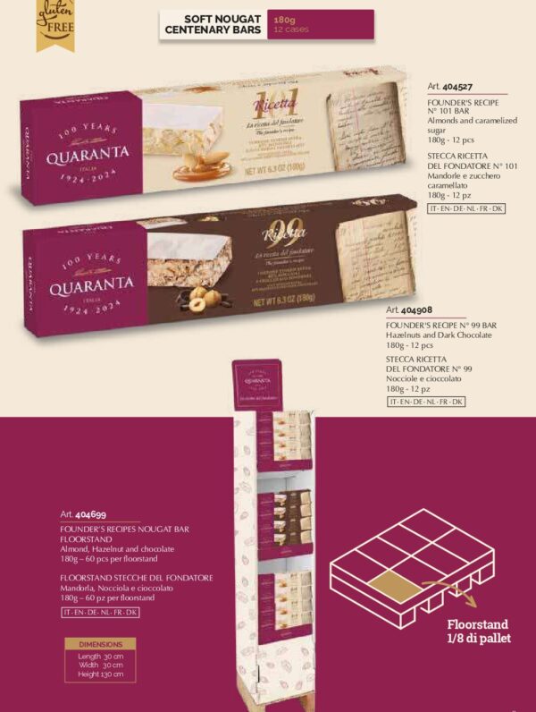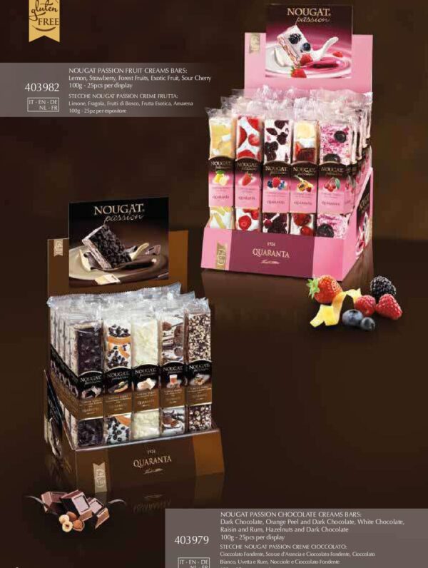 Soft nougat barsSoft nougat barsIrresistible soft nougat bars, variegated in the dough with delicious pastry creams and decorated on the surface with quality raw materials: these are our top selling product! Product sheetsProduct sheets Nougat bars 180gNougat bars 100g RelatedDiscover the other products Nut BarsNougat: Nougat Passion ® and BarsNougat La Dolce VitaCaramelized nutsBrittle bars, 54, square bars, cakes, salted brittle bitesFlorentineSoft nougat portions and rollsSoft nougat bites and soft nougatsSoft nougat square bars and cubesSoft nougat cakes